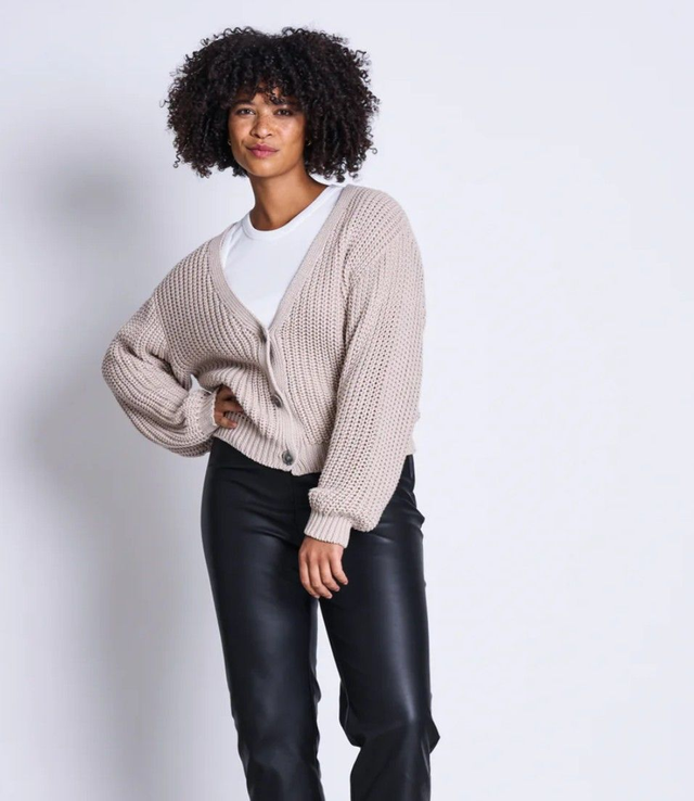 1. Cropped Strickjacke mit großen Knöpfen und einem V-Ausschnitt.